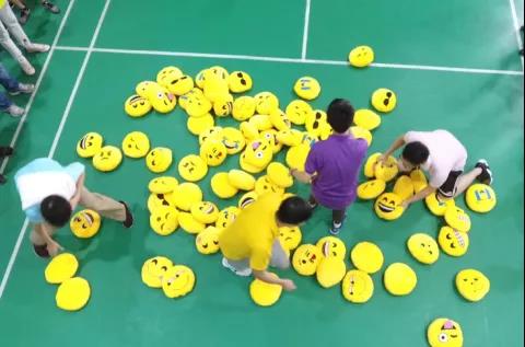 地面上放满表情包枕,运动员们按照教练的指示寻找、抢夺枕头;每轮每队派出5人参赛。