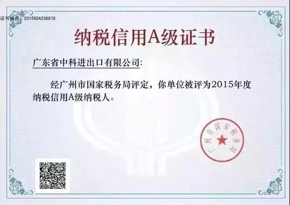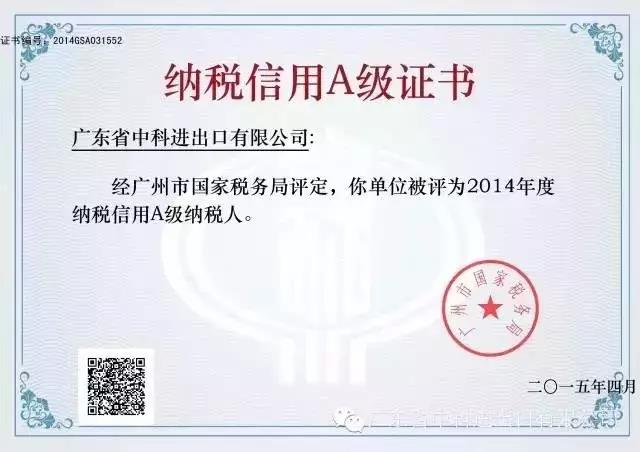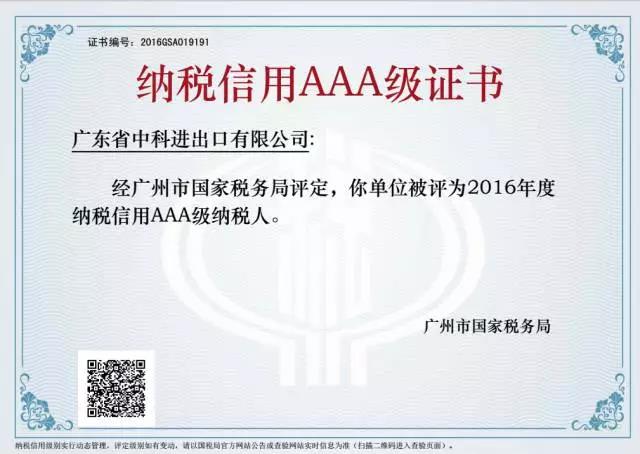 我司被评为2016年度纳税信用AAA级企业,是广州市国家税务局对我司的高度赞扬和认可。今后我司将在银行、税务、工商等部门享受特殊通道,能更便利快捷地办理各项业务,为中科的客户提供更高效、优质的服务。