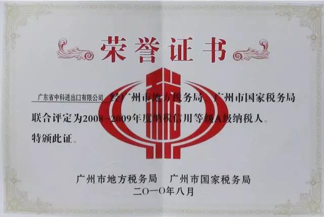(2008-2009年度A级纳税人荣誉证书)