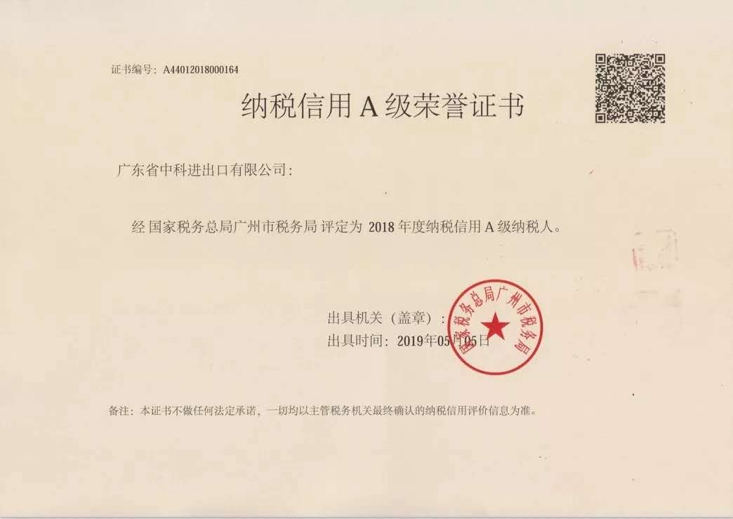 获得广州市国家税务局颁发“2018年度纳税信用A级荣誉证书”